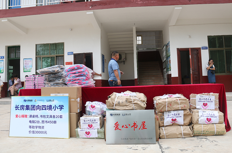 隨后,進(jìn)行了溫馨隆重的捐贈儀式。四境小學(xué)楊林校長接過捐贈牌露出了憨厚開心的笑容,孩子們更是喜笑顏開,對新書包和文具愛不釋手。450本兒童書籍和15套點讀機(jī)豐富了“愛心書屋”的藏書和設(shè)施,也傳遞著長房集團(tuán)對鄉(xiāng)村孩子們濃濃的愛意。