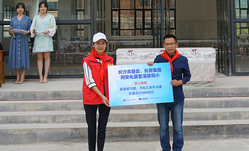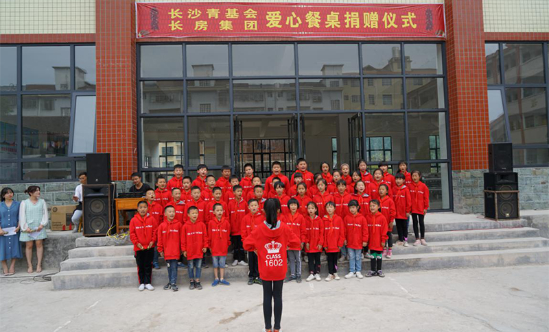 “金色的駝鈴,叮當叮當,小駱駝帶著它走向遠方,追趕著春天的腳步叮當,走向綠色的希望?!敝赡矍宕嗟母杪曉诎不h奎溪鎮(zhèn)完全小學校園里響起,融化著眾人的心。2019年9月25日,長沙青基會與長房集團共同舉行的“大愛奎溪完小、情暖校園食堂”愛心餐桌椅捐贈儀式在安化縣奎溪鎮(zhèn)完小舉行。儀式現(xiàn)場,長房集團“藍絲帶”愛心傳遞基金向?qū)W校捐贈了70套餐桌椅,并給學校30名貧困學生帶來了書包、文具等新學期禮物,本次愛心捐贈價值60000元。長房集團黨群工作部負責人,長沙市青少年發(fā)展基金會辦公室負責人,長房集團十余名青年志愿者,安化縣教育基金會、奎溪鎮(zhèn)政府、奎溪鎮(zhèn)中心學校的領(lǐng)導及奎溪鎮(zhèn)完小師生代表出席了捐贈儀式。