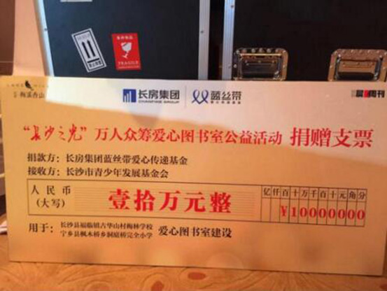 2016年初,晨報周刊攜手長房梅溪香山、長房集團(tuán)藍(lán)絲帶愛心傳遞基金共同發(fā)起“萬人眾籌圖書館”愛心公益活動,為湖南貧困山區(qū)學(xué)校捐建圖書室。以點(diǎn)亮希望之光、傳遞溫暖力量為主題的“長沙之光”微信文稿每被轉(zhuǎn)發(fā)一次,即為籌建山區(qū)學(xué)校愛心圖書室捐贈5元?;顒娱_展以來,贏得了許多社會愛心人士的熱烈反響和廣泛共鳴,共有1萬余人次參與活動,最終,通過長房集團(tuán)藍(lán)絲帶愛心傳遞基金捐款10萬元,用于長沙縣福臨鎮(zhèn)古華山村梅林小學(xué)和寧鄉(xiāng)縣灰湯鎮(zhèn)洞庭橋完全小學(xué)兩所貧困學(xué)校愛心書屋的建設(shè),長沙市基少年發(fā)展基金會理事長羊舒麟代表兩所學(xué)校接收捐贈。