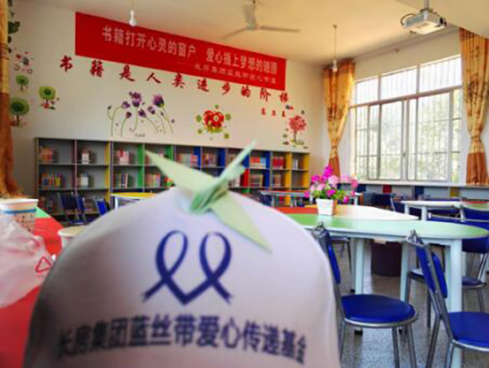 長房集團(tuán)藍(lán)絲帶愛心傳遞基金成立于2007年,由長沙市青少年發(fā)展基金為代為管理。歷年來開展了“小書包,大夢想”、“有愛,夢想才有翅膀”、“情牽抗戰(zhàn)老兵、心系山區(qū)學(xué)子”等一系列主題愛心公益活動,積極援建學(xué)校、修繕操場、捐贈課桌椅、文體用品,捐建圖書室等,援助學(xué)校20余所,受益學(xué)生近萬名,累計捐贈愛心助學(xué)物資160余萬元,直接資助省內(nèi)各大高校寒門學(xué)子63名。此外,在汶川地震后,為災(zāi)區(qū)募捐和捐獻(xiàn)共近200萬元。